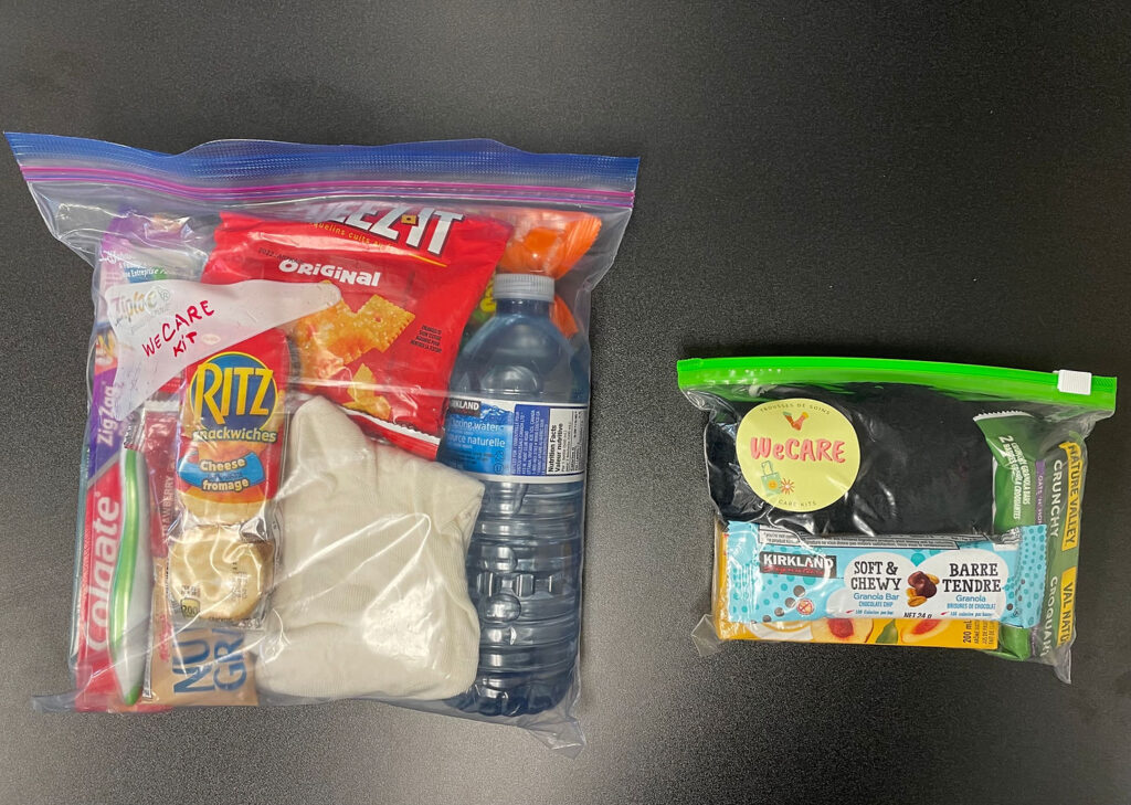 Originally, her students would put together a list of items which she’d go and buy from the dollar store which would then be packaged and distributed. This year, however, the college partnered with We Care Project and received 150 bags from them.